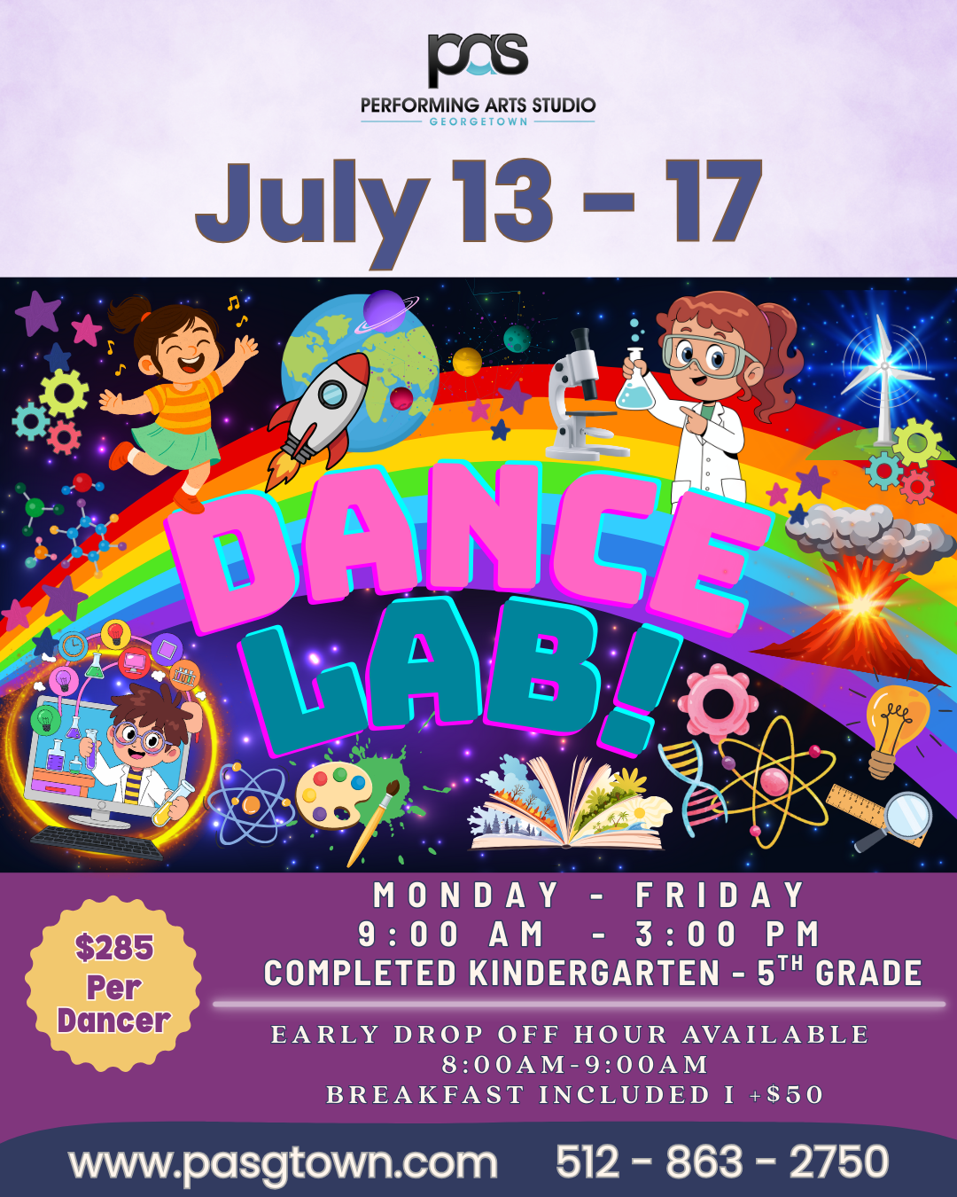 Dance Lab - Full Day (completed Kindergarten - 5th Grade) Monday, July 13, 2026 9:00 AM Friday, July 17, 2026 3:00 PM Performing Arts Studio 900 North Austin Avenue, Suite 123 Georgetown, TX, 78626 United States (map) Google Calendar ICS Learn more